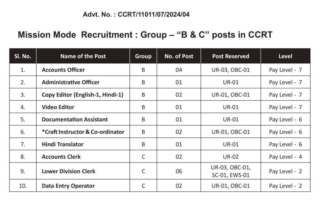 Ministry of Culture, Government of India’s Centre for Cultural Resources and Training (CCRT) announces vacancies for Group B and C posts through direct recruitment. Eligible candidates are invited to apply for positions such as Accounts Officer, Administrative Officer, Copy Editor, Video Editor, and more.